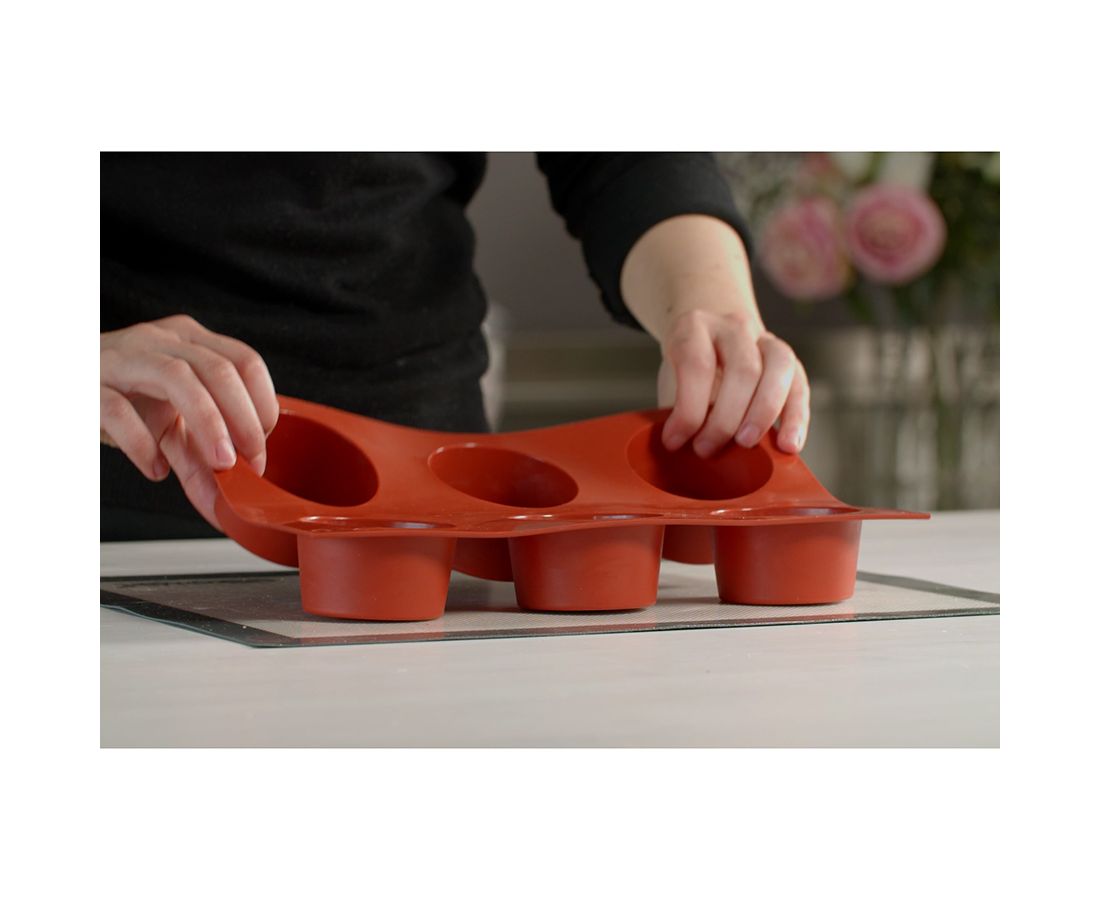 Форма выдерживает температуру от - 60 до +, 230 °С. Силикон не содержит вредный бисфенол-А и соответствует европейским стандартам качества. Он не имеет запаха и не дымится во время готовки. Материал гибкий, прочный, устойчивый к перепадам температур. Форма выдерживает до 3000 использований. Перед использованием необходимо смазать изделие маслом. Диаметр ячейки - 5 см, объем - 100 мл.