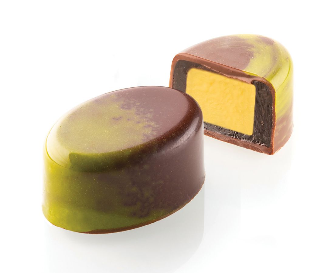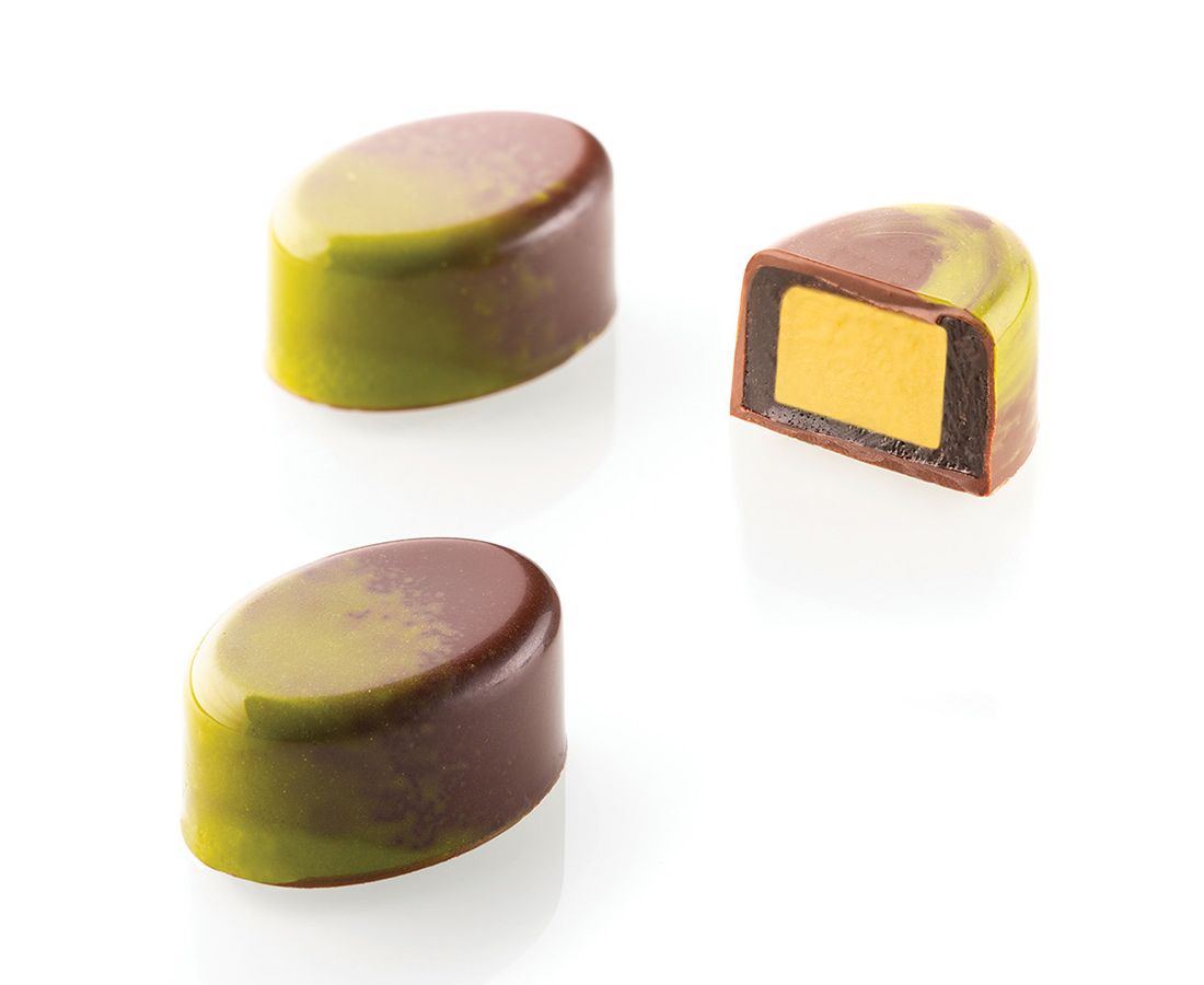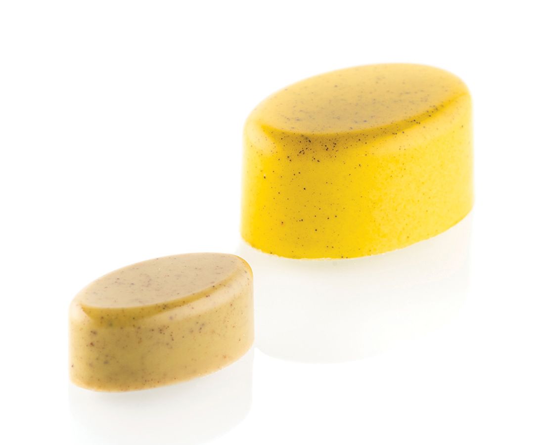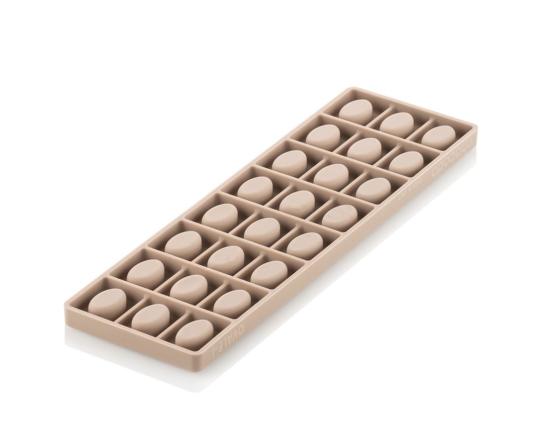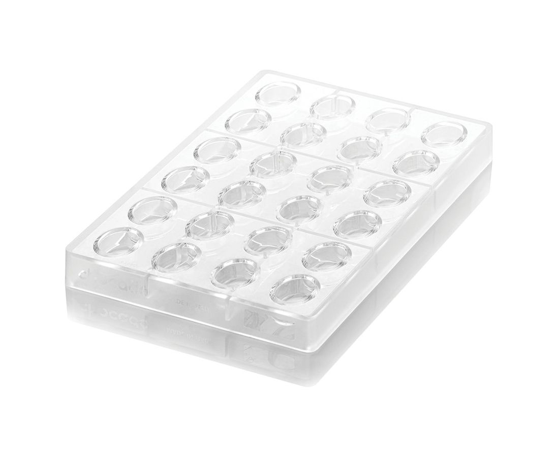 Одна форма выполнена из тритана, вторая – из силикона. Материалы устойчивы к перепадам температуры, не содержат вредных соединений, не впитывают запахи и загрязнения. Изделия позволяют одновременно приготовить 48 конфет овальной формы разных размеров.