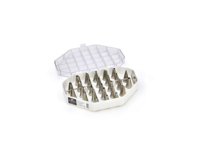 De Byuer это профессиональная кухонная утварь в лучших французских традициях.Набор с 26 насадками из стали + адаптер + 2 подставки для украшения шоколадом/кремом/глазурью для письма или создания листьев, цветов. Поставляется с адаптером для замены насадок на том же кондитерском мешке.